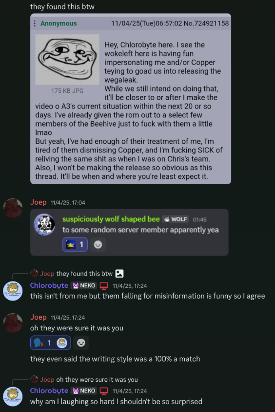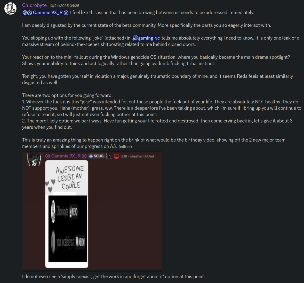 A3's development has also solidified the server as a hotspot, an 'official source' of sorts. It should have been made very clear that the Beehive was for shitposting and being silly, not as a holy source with occasional declarations by the Great Grass Cat Chlorobyte, and it should have been made clear where the serious announcements were (the blog / occasional drops on the YouTube channel).