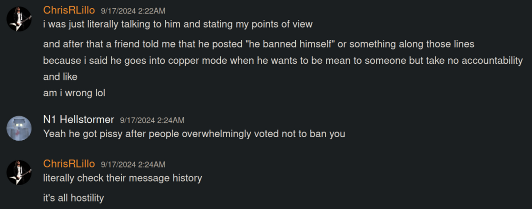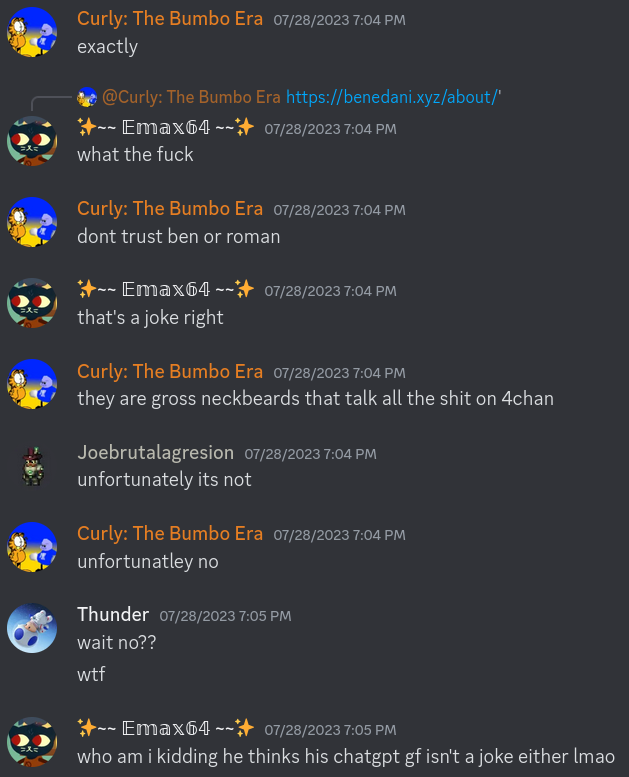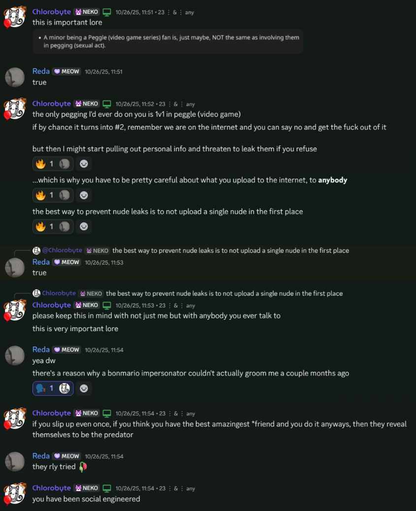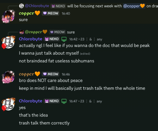 If this whole thing starts affecting my reputation to the point of hitting my finances, the defamation suit that follows is going to go incredibly hard. Especially when they get to this discussion in our DM group: