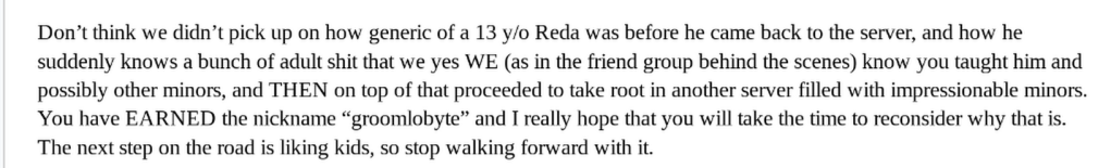 - you having concerning behavior in relation to reda given the context of your political doc, like being obsessed with unbanning him and trying hard to get him onto the dev team, you also believed reda was 13 despite the fact at the time we had evidence of the contradictory