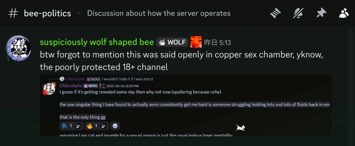 It does not matter, as the message in question had just been casually reposted into the open within the #bee-politics discussion. The new B33h1v3 just made it easier for me to — hypothetically speaking — get new victims to play with.